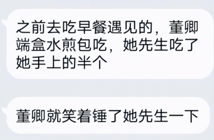 近日,有网友吃早餐时偶遇董卿及其先生密春雷,并且在网上曝出他们相处的甜蜜细节:董卿先生吃掉董卿手上的半个水煎包,于是董卿笑着锤了她先生一下,两人相处十分腻歪。