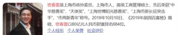 密春雷本人相当不简单,出身贫农白手起家的他,在商界叱咤风云,2025年更是在某财富榜中以60亿元人名币财富排名684位,获得诸多殊荣。