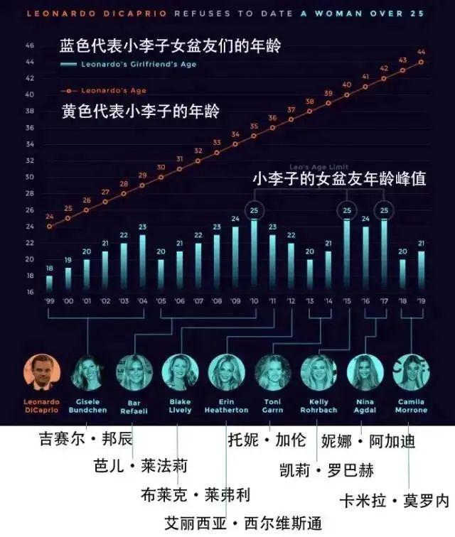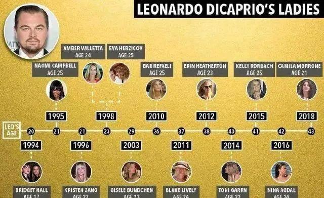 细数小李子的历任女友,没有任何一位是超过 25 岁,年龄红线从未消除,此后,这个奇奇怪怪的定律被广为流传。