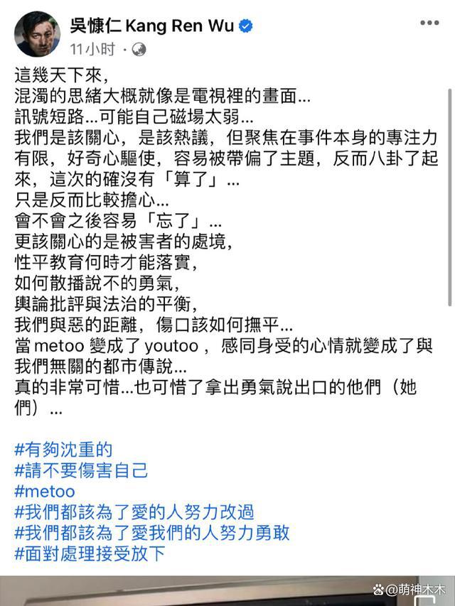 面对侵犯事件,吴慷仁也发文称让大家聚焦焦点,不要被八卦带偏主题,希望多关心受害者处境,如何散播说不的勇气,舆论批评与法治的平衡。