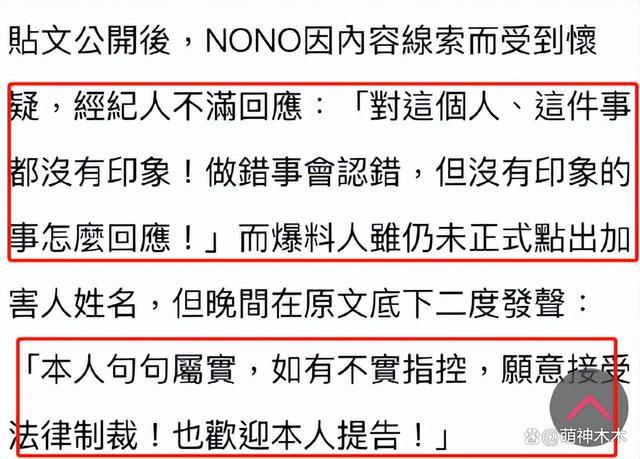 爆料火后,NONO 经纪人回应称对这个人这件事都毫无印象,做错事情会道歉,但没有印象怎么回应,受害者也坚称句句属实,欢迎提告。而爆料者之一的网红听到 " 他忘了 " 的说辞,更是召开记者会继续大爆料,还公开了相关简讯。