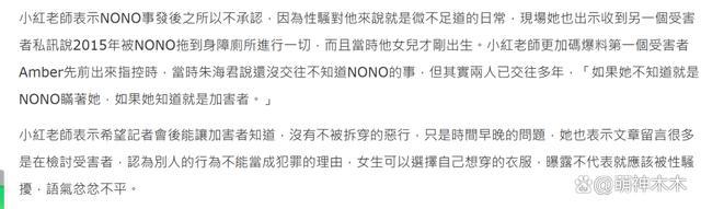 NONO 骚扰的时间之久令人错愕,当记者询问小红如何看待他妻子朱海君说那时没交往不了解的说辞,小红称按照时间点朱海君与 NONO 已交往多年,如果她不知道可能就是被瞒,如果知道就是加害者的一份子。