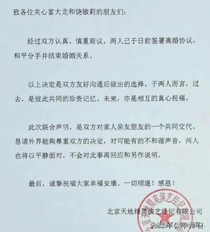 而富大龙最近一次被人记住还是离婚事件,今年2月初,他与前妻饶敏莉正式官宣离婚,在社交平台上发文称“一切更美好,彼此珍重”。两人表示是和平分手并结束婚姻关系,消息曝出后令人唏嘘不已。