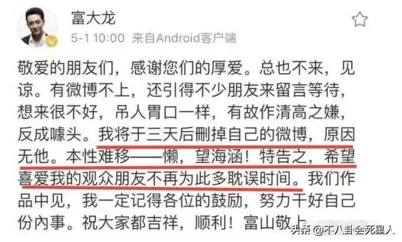 在今年5月时,富大龙在社交平台上发文,先是感谢了大家的厚爱,接着他便说自己将于三天后清空所有的动态,原因无他,是因为自己很懒。并且他还表示“希望喜欢我的观众朋友不要为此多耽误时间,我们作品中见。”