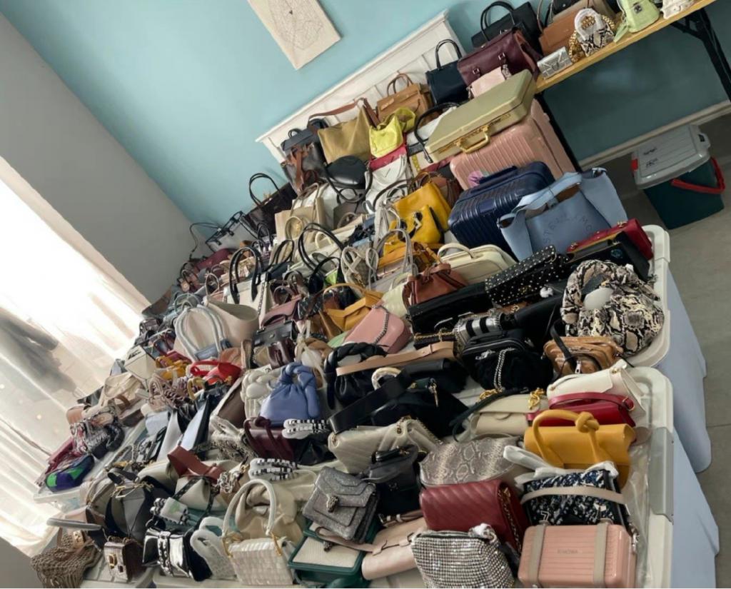 左手拎着奶白色爱马仕大包,右肩跨的是华伦天奴漆皮小黑包。