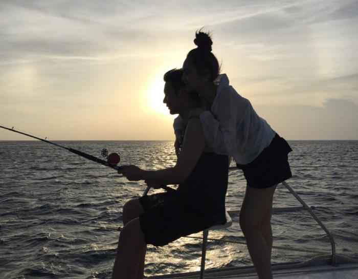 只见照片中两人依偎在一起,杨丞琳搂住正在钓鱼的李荣浩,两人都露出甜蜜笑容,情侣恩爱羡煞旁人。