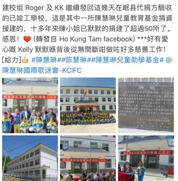 2002 年,陈慧琳成立了儿童助学基金,为了帮助孩子解决上学问题,她捐建希望小学,目前已经有 50 多所。
