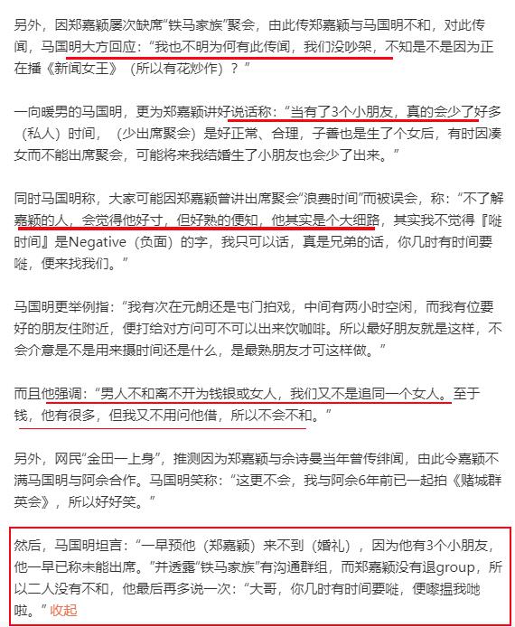 记者问郑嘉颖近期经常缺席铁马家族活动,是不是和马明闹不和,会不会参加马明婚礼等等。