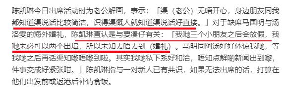 陈凯琳刚晒了去非洲旅行,用行动表示有 3 个小孩也是可以出远门的,那边个小孩就成了不参加婚礼的挡箭牌,网友表示自己的智商不容许自己信这个理由。