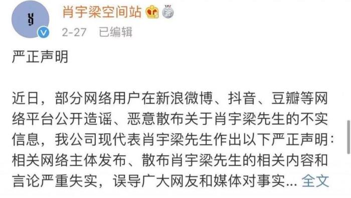 网络上很多爆料都是没有得到证实的,真真假假难以确认,但是面对这些黑料,肖宇梁方面全盘否认了,其经纪公司发表了声明表示将会起诉散播谣言的相关网友,而公司也专门请律师来发布了声明,指责了那些散播谣言的始作俑者。