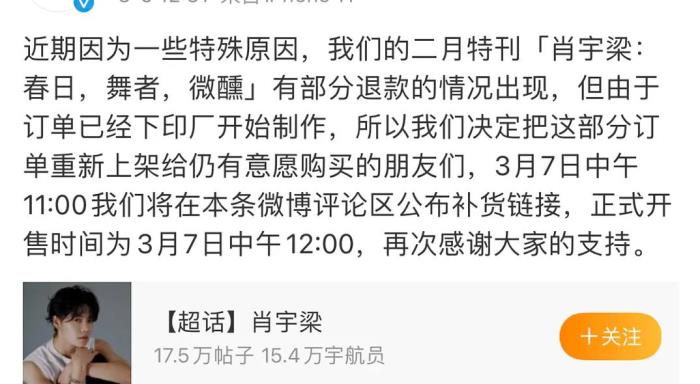 日前肖宇梁拍摄的某杂志官方微博发文,直接指出有大量粉丝退款,导致很多原本已经下单开印的杂志积压,本来是二月特刊,没想到已经3月6日了,杂志方还会亲自点名指出粉丝退款的问题,看来是有很多粉丝退款了,才会逼得杂志方出来催销量吧。