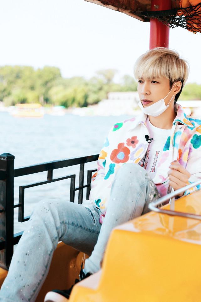 画面中的张艺兴身穿印花的白色外套,搭配浅灰色的破洞牛仔裤,一身造型也显得特别的休闲舒适。他坐在小船上,一路欣赏着湖中的美景,小日子也过得十分的惬意。