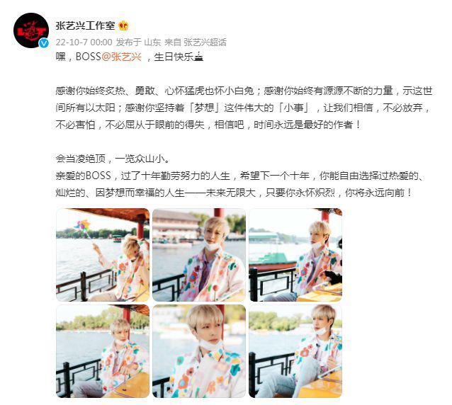 10 月 7 日是张艺兴的 31 岁生日,当天张艺兴工作室也在零点零分的时候晒出了一组张艺兴的帅照,并且送上了真挚的祝福:" 过了十年勤劳努力的人生,希望下一个十年,你能自由选择过热爱的、灿烂的、因梦想而幸福的人生——未来无限大,只要你永怀炽烈,你将永远向前!" 一时间也受到了网友们的广泛关注,收获了不少的点赞和祝福。