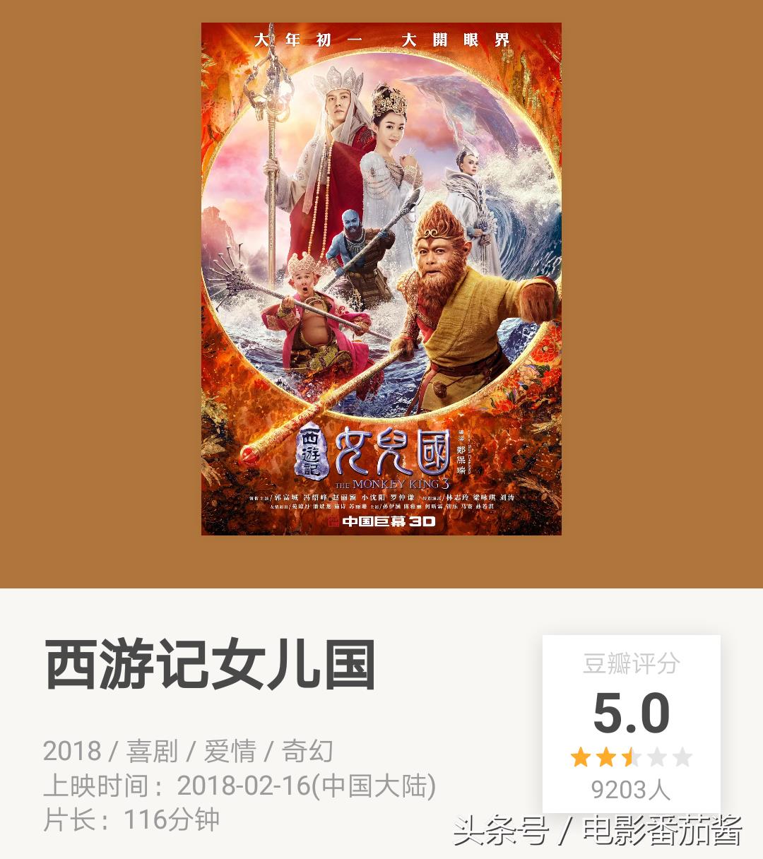对于这部西游大电影,网友的评价也是褒贬不一,目前《女儿国》在豆瓣上的评分已经出炉,情人节点映加除夕夜共9000多人打出了5.0的分数。
