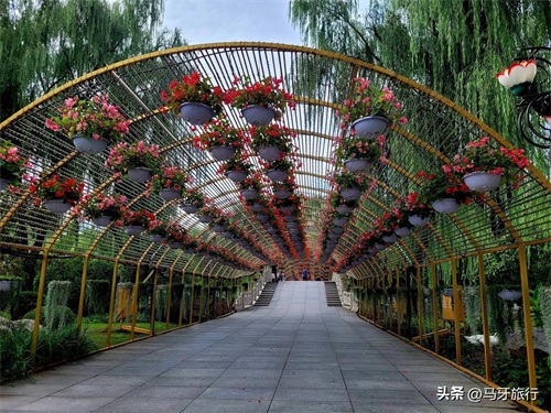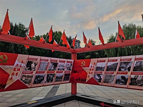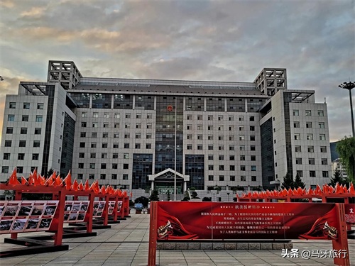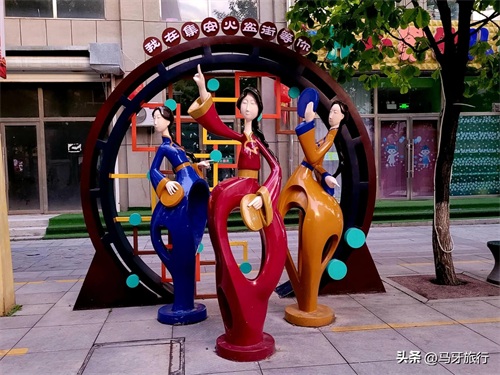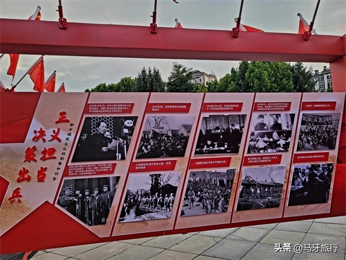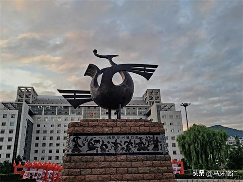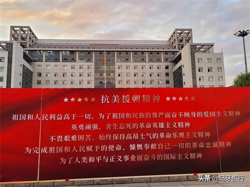 市政府前是一开满鲜花的小广场,广场上有个“太阳鸟"的雕塑,雕塑前面是关于“抗美援朝精神”的红色宣传走廊。