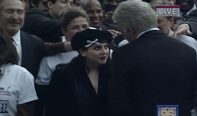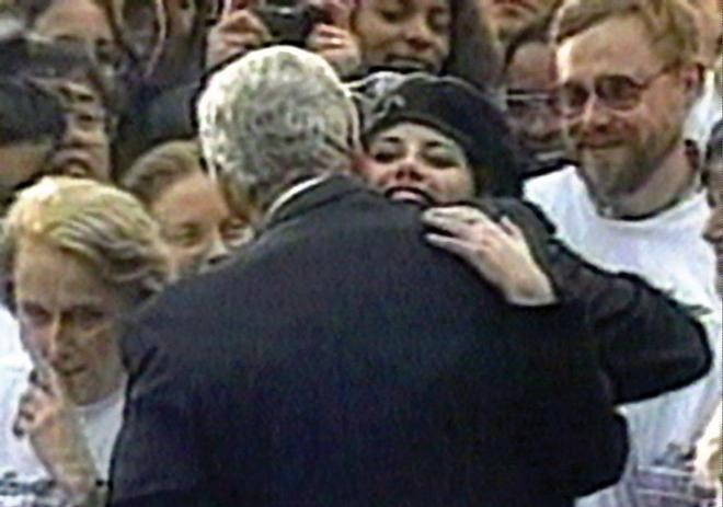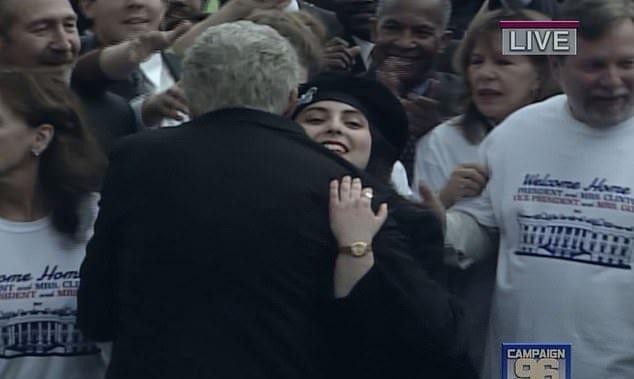 她公开拥抱克林顿,此举后来成为笑柄。拥抱结束后,克林顿俯身对她说了些什么,但没有人听到那是什么。