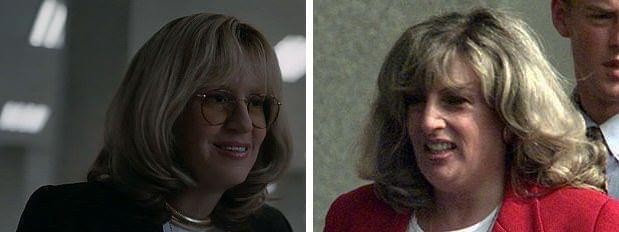 莎拉·保罗森饰演的琳达·特里普和真实的琳达·特里普于 1998 年 7 月 28 日出现在华盛顿。