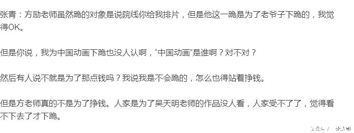 对于方励为《百鸟朝凤》下跪,张青也是话里有话。方励的下跪是一种情怀,更是一种营销方式。