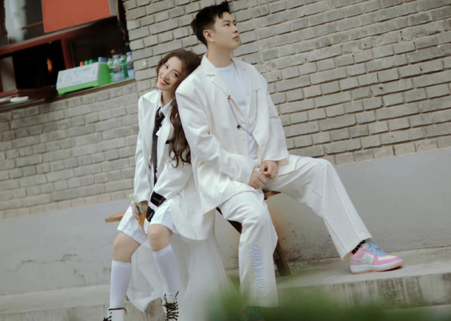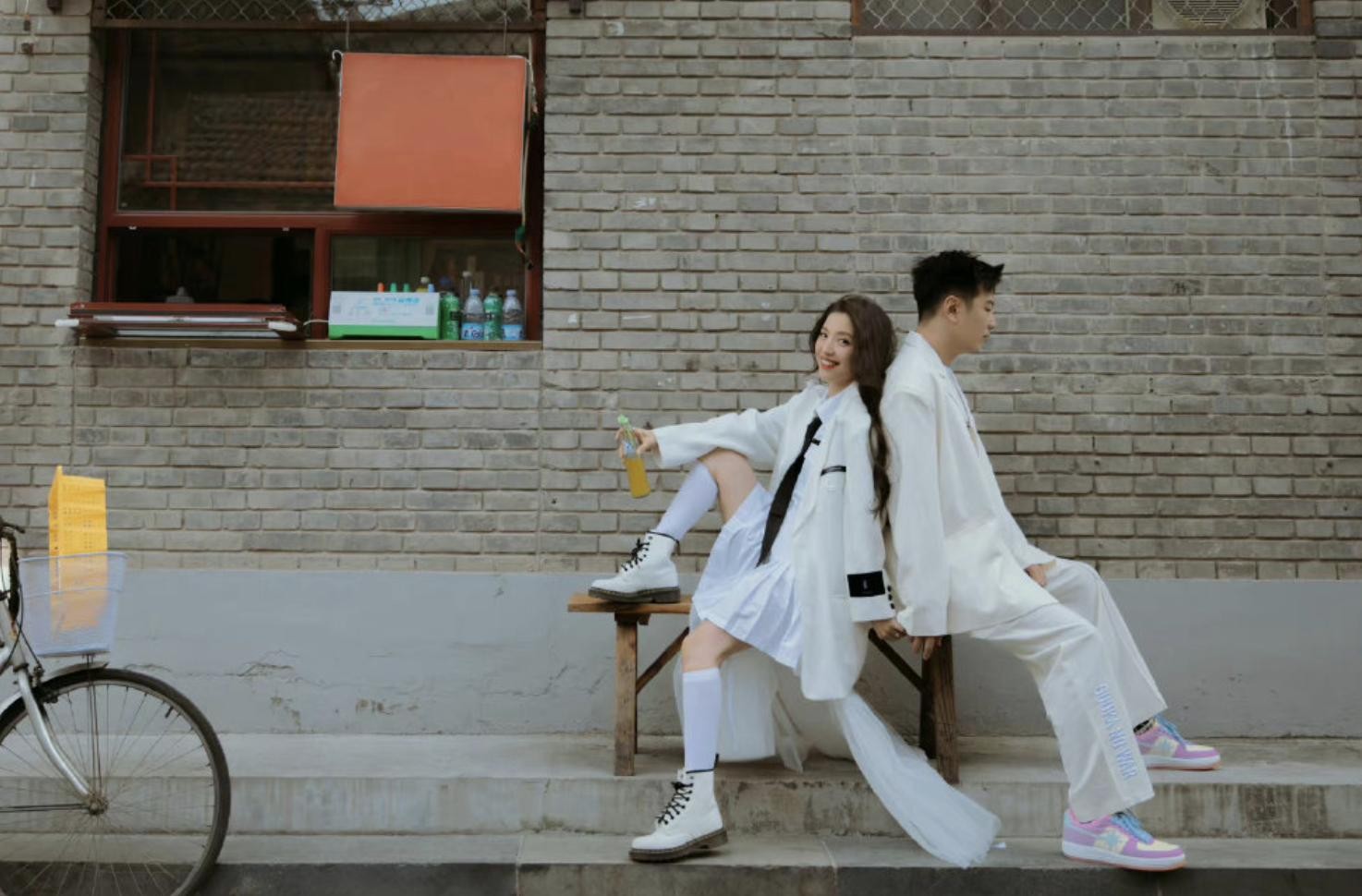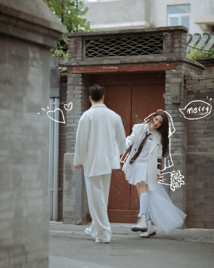 夫妻俩在一条古风古味的街巷里合影,氛围感十足。