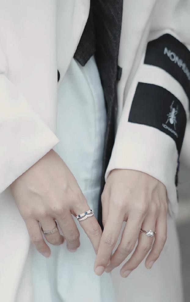 乍一看还以为是潘辰和丈夫手牵着手,但仔细观察其实都是潘辰自己的手,无名指上的爱心钻石好闪。