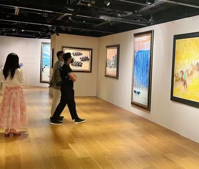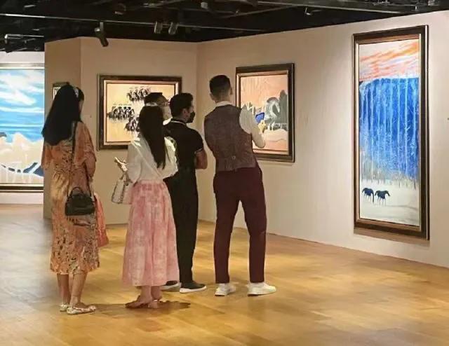 旁边的工作人员非常认真地向郭富城讲解墙上的艺术品,而方媛则在丈夫身后玩手机,似乎并不在乎挂在墙上的艺术品。