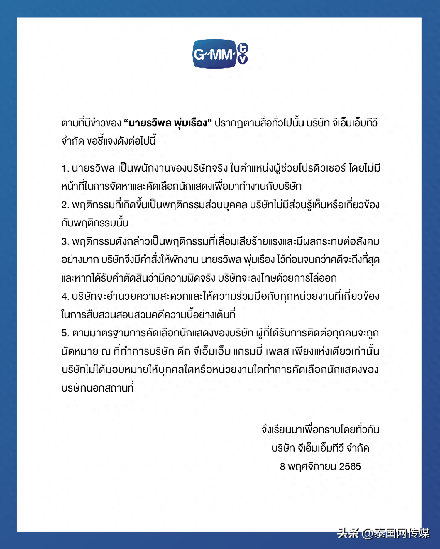 11月8日下午,GMM公司就此事发布声明,具体如下: