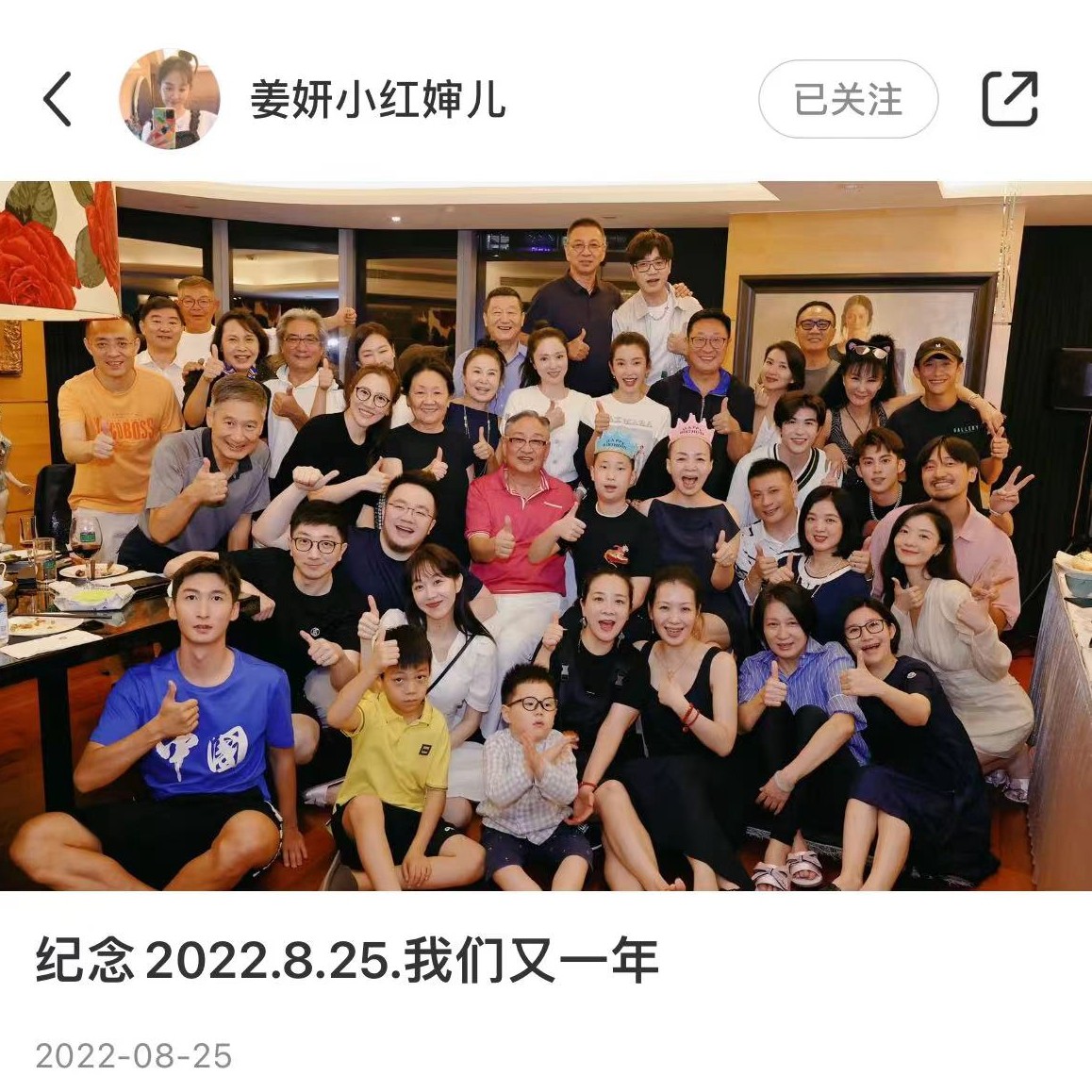 2022年,姜妍等人给宋丹丹庆生,姜妍在自己的社交网发布了大合照,丈夫就在她旁边。
