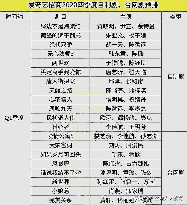 爱奇艺将在2020年第一个季度播出一些看起来还不错的电视剧,比如孙红雷、张鲁一和万茜联手主演的《新世界》,刘涛、周瑜民主演的《大宋宫词》。这两部剧作不仅仅是主演值得期待,剧情也值得期待,冷丝希望日后的播出不负众望。