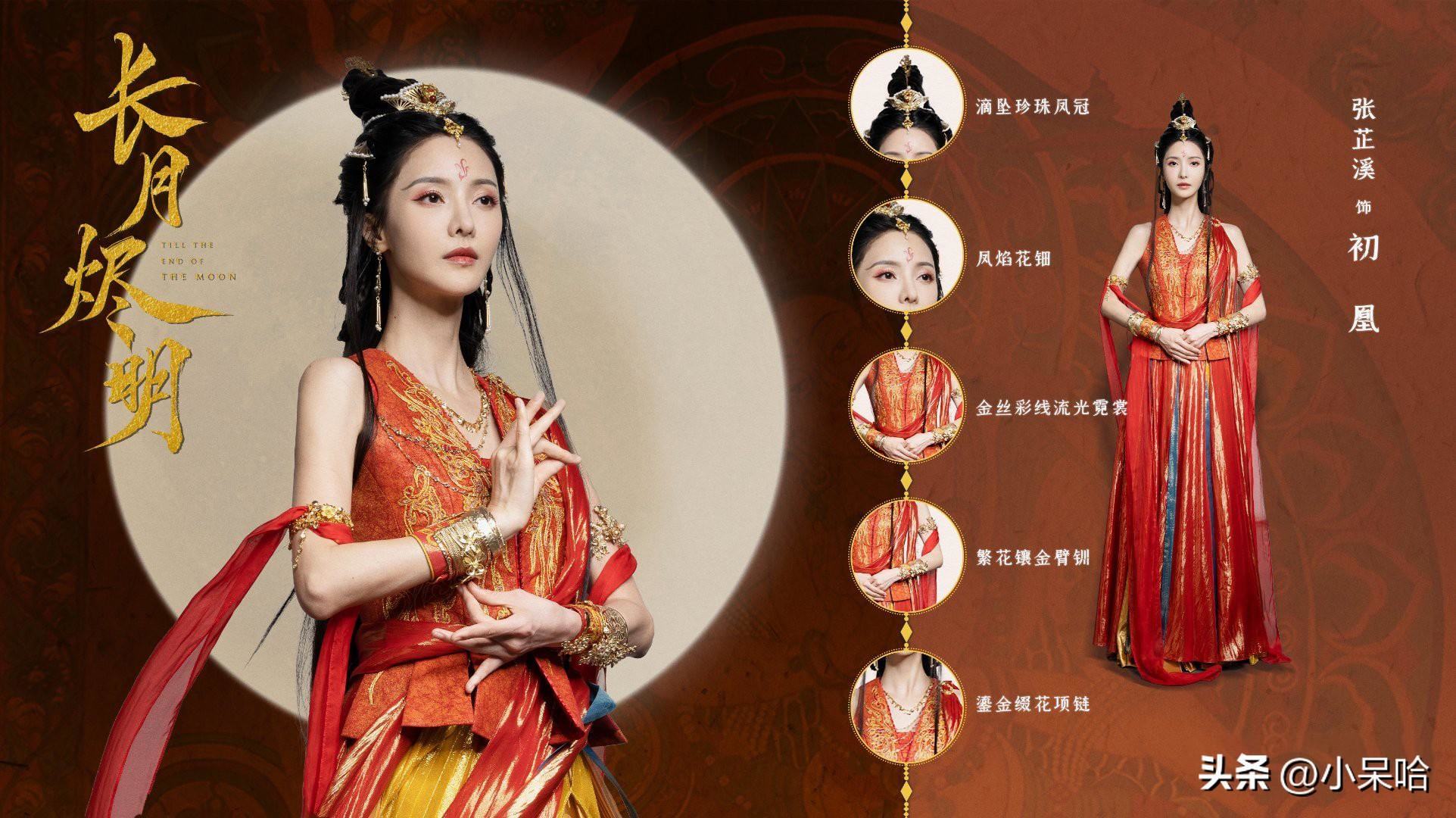 滴坠珍珠凤冠、凤焰花(金字旁加个田)、金丝彩线流光霓裳、繁花镶金臂钏、鎏金缀花项链。