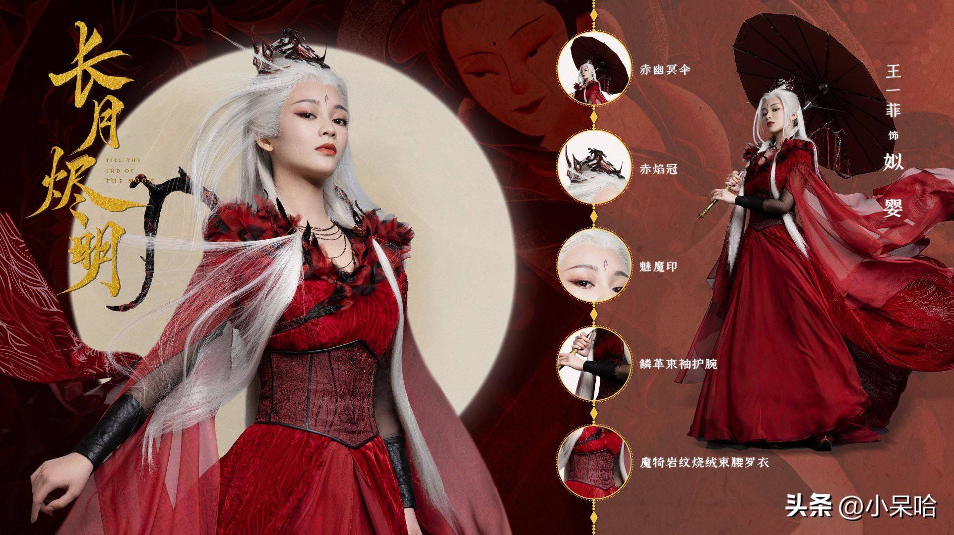 赤幽冥伞、赤焰冠、魅魔印、麟革束袖护腕、魔岩纹烧绒束腰罗衣。