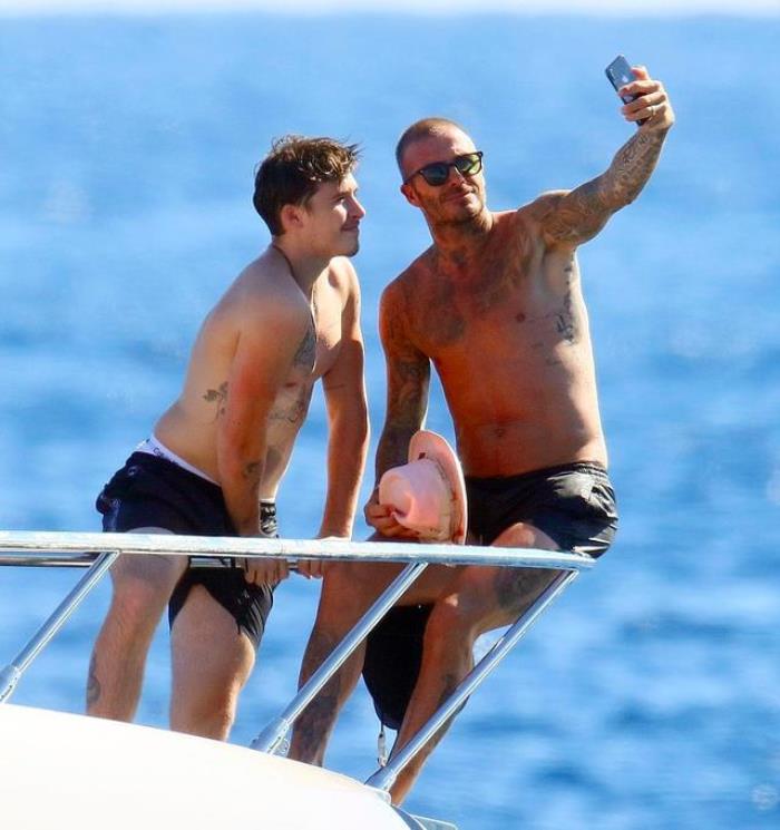 孩子们在一旁玩耍,贝嫂则一直在一旁忙着拿手机拍照。贝克汉姆还不忘拿着手机和大儿子布鲁克林自拍,布鲁克林赤裸着上身,可以看到他如今发福了不少,整个人看起来比老爸还要胖。