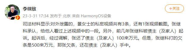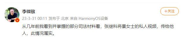 果然,在张继科方面发布声明 4 小时后,媒体人@李微敖 半夜发布的一条微博,让此事的热度再次升级。尤其博文中提到 " 张继科将景女士的私人视频,传给他人,此情况属实。" 让被此事波及的女主角清晰起来。