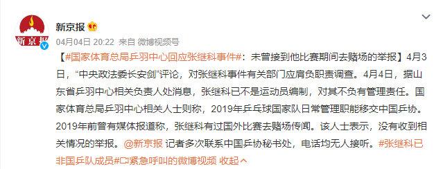 4 月 4 日,国家体育总局乒羽中心相关人士表示,对于此前媒体报道张继科出国比赛时去赌场的传闻,当时并未收到过相关情况的举报。山东省乒羽中心相关负责人表示,张继科已非运动员编制,该中心对其不负有管理责任。