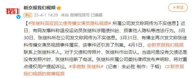 4 月 1 日,媒体联系到张继科本人,当被问及是否因欠债传播他人隐私视频时,张继科表示 " 没有 "。但当媒体继续追问是没有欠债还是没有发照片时,张继科没有回答,直接挂断了电话。