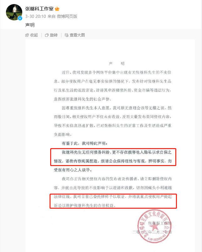 就在上述爆料博文发布 2 小时后,张继科工作室反应迅速,当即发表声明对爆料内容作出否认。同时,声明内容还表示,张继科方面将委托律师取证,对重点侵权用户提起诉讼。对于多次见证知名人士塌房翻车的广大网友来说,张继科方面的声明显然无法让他们信服。事件的发酵并未因一纸声明而停止,反而有愈演愈烈之势。