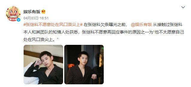 此时,占据微博热搜多日的张继科本人,在之前的几番发声过后选择了沉默。4 月 3 日有消息流出称,张继科不愿再回应此次事件的原因之一为 " 他不太愿意自己处在风口浪尖上。" 但此事的发展显然不会因此戛然而止。