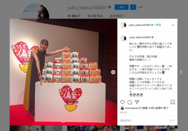 本月1日,竹内出席了她出演的拉面广告“札幌一番”的活动。同日,她更新自己的Instagram“大家暑假期间是否也过得元气满满?我为了新学期,去修剪了刘海”,并披露了自己的新发型。