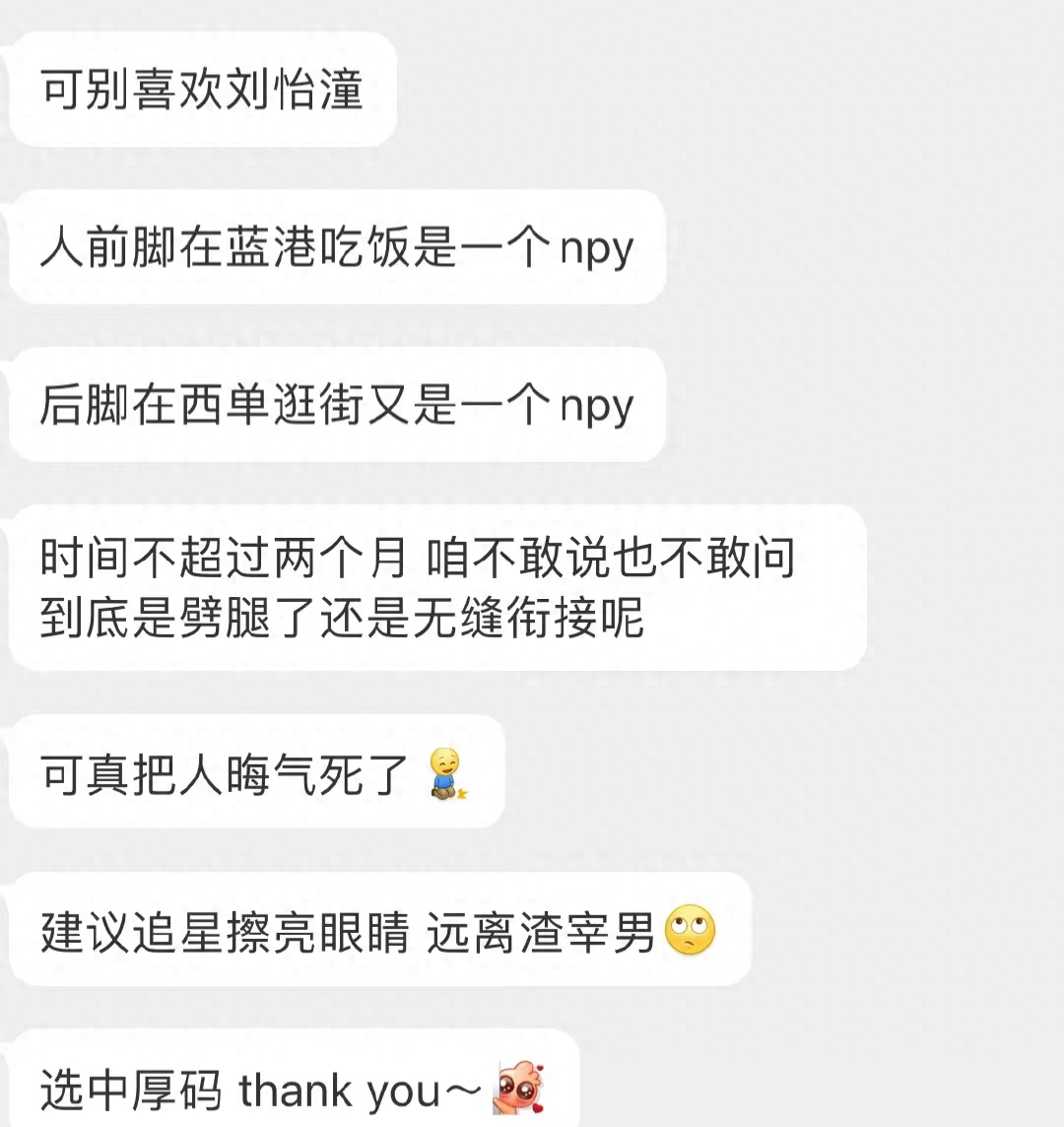 紧接着,该网友晒出自己删除手机内一切有关刘怡潼的照片,并发文称“希望以后都不要再遇渣男了”。