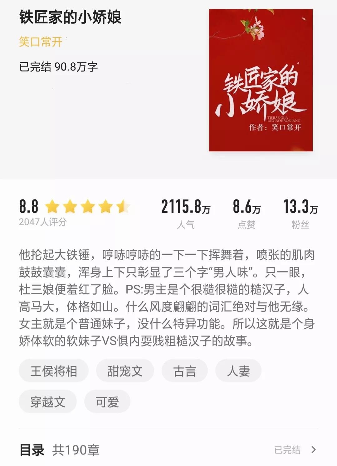 今天推荐的是:穿越农家女杜三娘与打铁匠陆湛惩治了极品四叔一家,让全家过上幸福,父慈母爱、姐弟相爱有佳,搓和亲友颜怀卿和孟璇的今世姻缘,但因战争两人分离八年,终得功成名就幸福#小说#