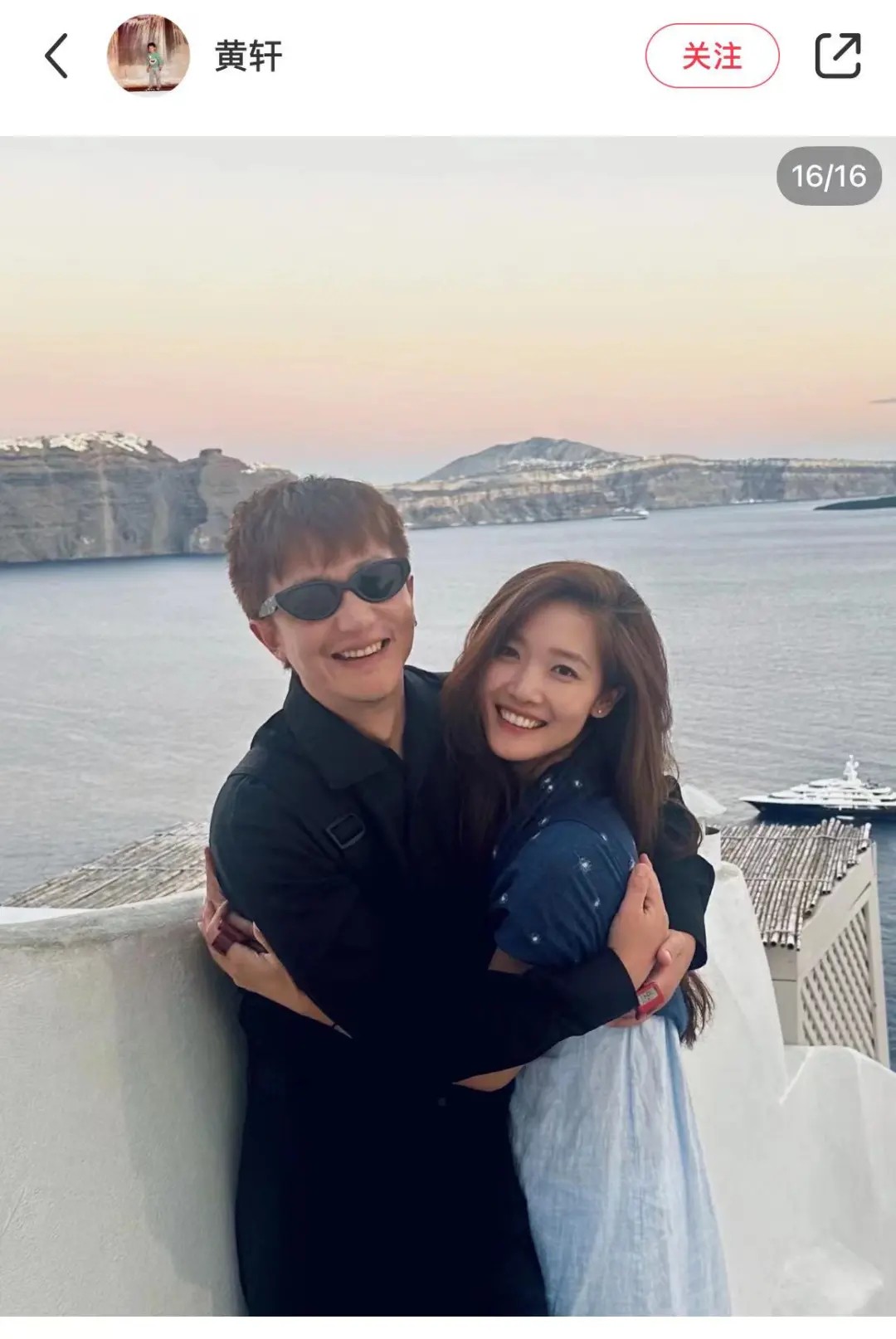 合照中,黄轩穿黑衣造型简单,女朋友露出灿烂笑容被黄轩搂在怀里,画面甜蜜。