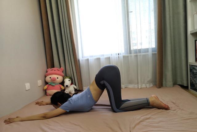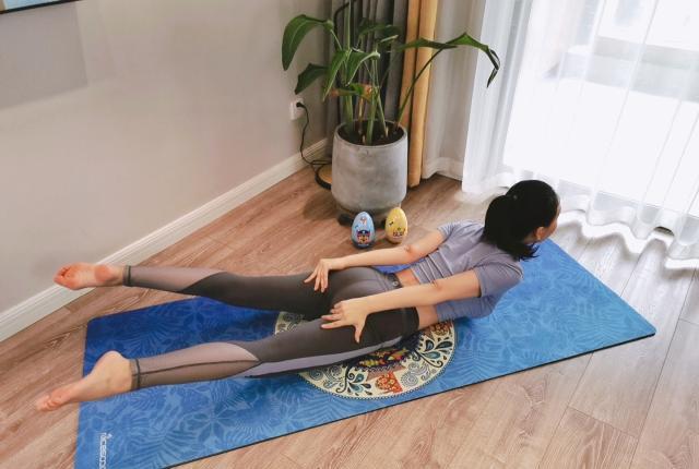 动作1:趴在硬床上或瑜伽垫上,手臂撑起上半身然后使劲往后仰,用力去拉伸背部。掌心是很伏贴地在瑜伽垫上的,手臂不用向两侧打开特别宽的距离,到时候会做起来有点别扭。可能很多人有看过这个动作腿部是不需要曲起来的,但是我做的时候会曲起小腿,是想尽量使脚尖去靠近头部。这样就不仅拉伸到了背部,连小腿也能被有效的拉伸,同时也就瘦到了腿。真的是很好的一个瑜伽延伸方法。大家可以去尝试一下就能感受到那种酸爽了。