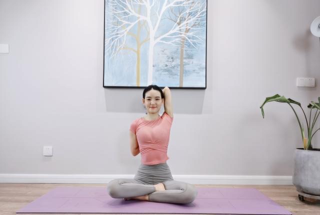 动作5:以自己舒适的感觉盘腿坐,一只手往后半折,掌心触碰到背部,另外一只手微微用力扶助手肘往下面掰,肩部位置会有酸痛感,是正常的。挺直腰板,头不要低下去,两眼平视前方。这个动作同样也是开肩的。停留15秒。做完一边的动作换另一侧一样的方式。