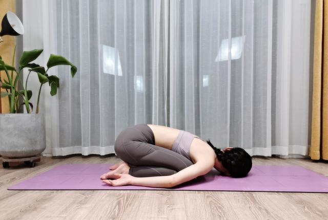 动作3:双腿并拢在一起,并且跪在瑜伽垫上,然后伸直手臂后上半身俯身慢慢地趴在垫上,手心自然地放在瑜伽垫上,以朝拜的姿势,大腿在胸部的位置,屁股后坐,上身有力度地往前拉伸,感受这种被拉扯的感觉,同时继续保持身体紧贴在地面。把头埋在瑜伽垫里,开始均匀呼吸,动作停留25秒。