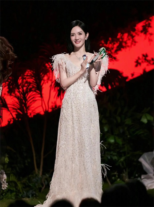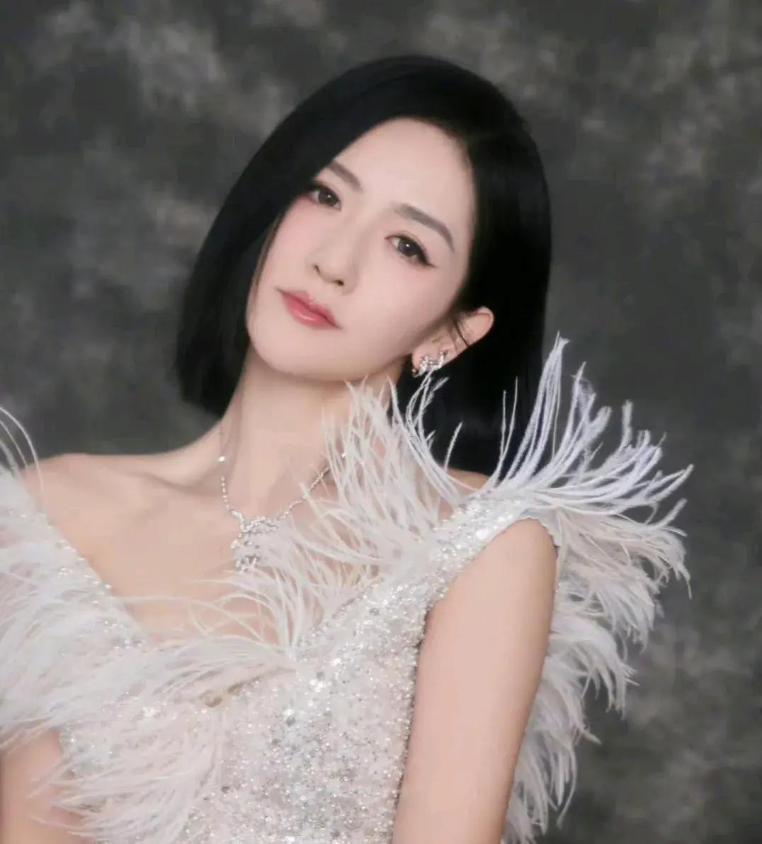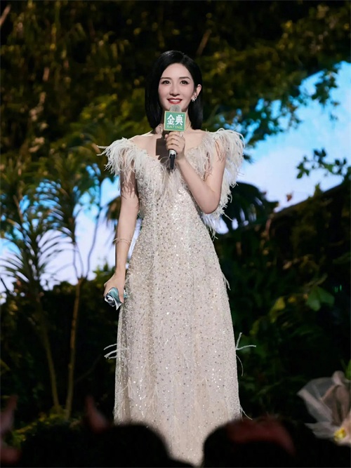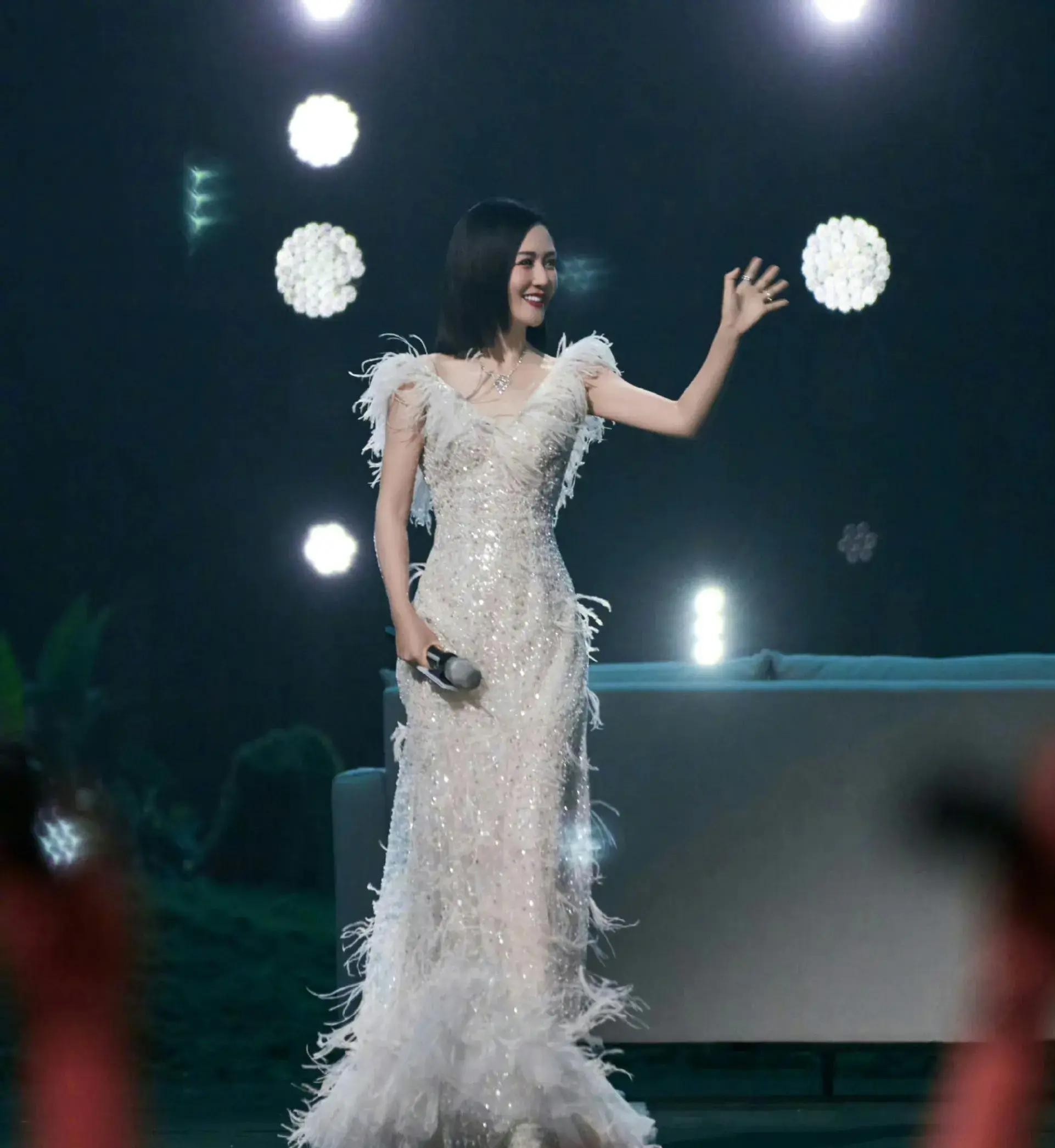 她的主持造型惊艳,齐肩短发,白色羽毛礼服,清新脱俗。