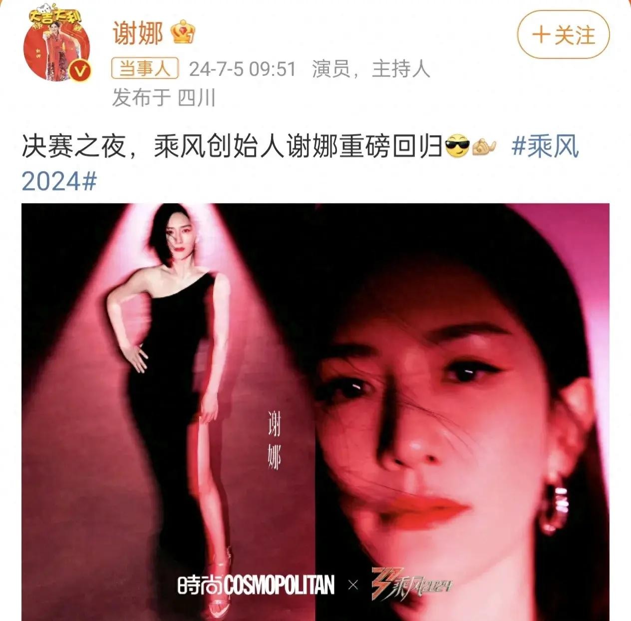 7 月 5 日,谢娜在社交平台发文晒照,官宣回归主持《乘风 2024》决赛。