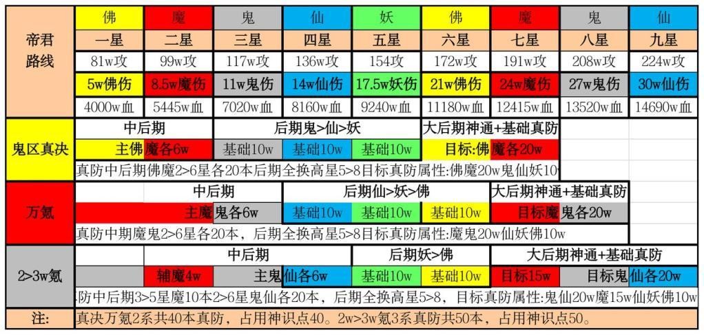 然后优先提升〖魔基础真防〗,2星魔帝君依靠提升基础真防+神通真防攻略。之后在提升〖鬼基础真防〗攻略3星鬼帝君(后期血量高,基础真防足矣应对)