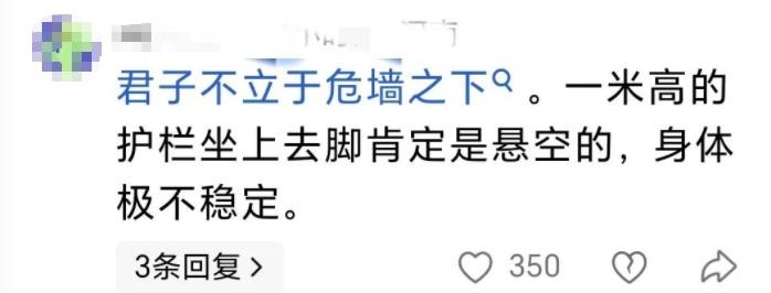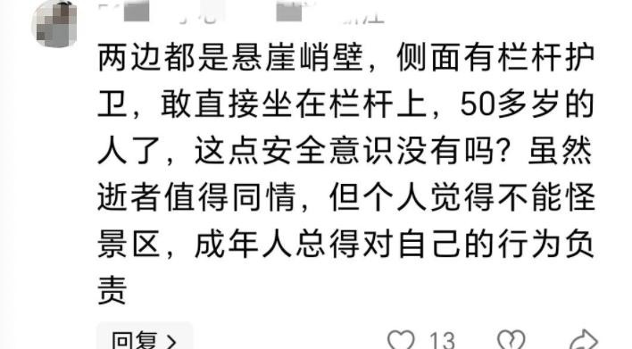 “成年人自己不长心,景区又不是保姆!”“大老爷们非得坐护栏上作死,摔下去怪谁?”“天天喊护栏太矮、标志不醒目,不如大家都别作死,命是自己的。”