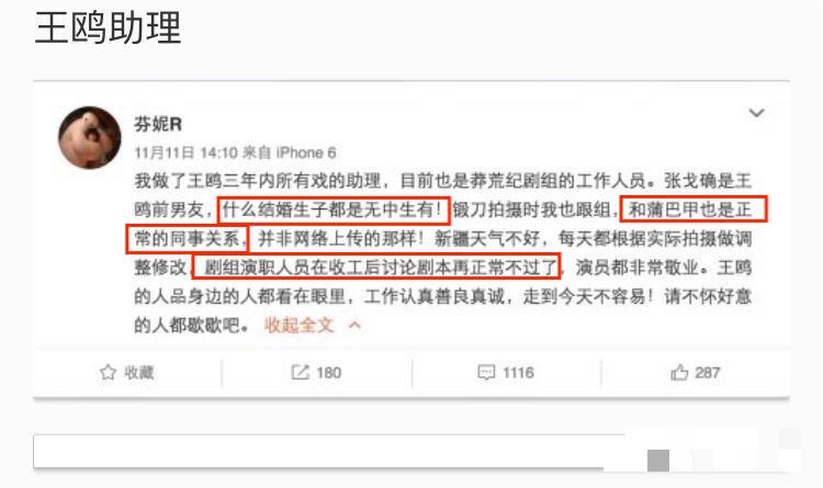 王鸥身边的助理出来发文解释了莫须有的结婚生子传闻,插足蒲巴甲感情也是造谣,最近的夜光剧本也是真的在讨论剧本。