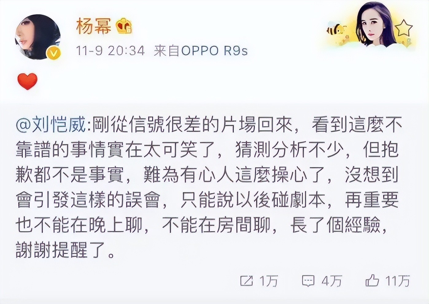 “夜光剧本”也自然而然波及到了刘恺威当时的妻子杨幂。