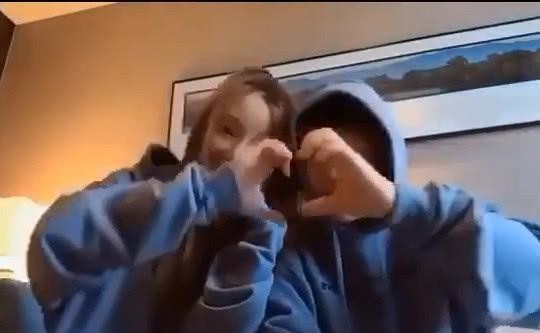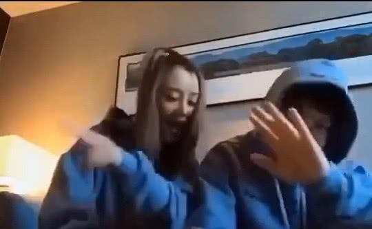 他们身着宝蓝色情侣装,一起表演舞蹈动作,比心。笑容超级可爱,画面再暧昧不过了。